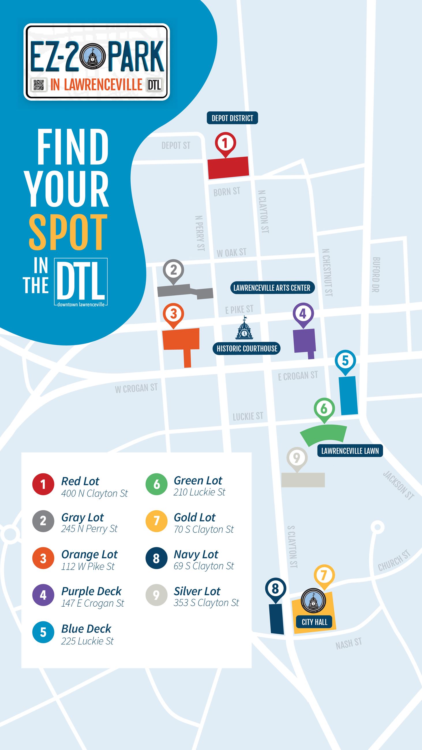 Parking in Downtown Lawrenceville is simple with the City’s EZ-2 Park program. With more than 1,200 free spaces across color-coded decks and lots, you’re always just steps from dining, shopping, and entertainment in The DTL.